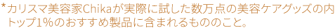 Instagramなどで美容インフルエンサーとして活躍するカリスマ美容家Chika(チカ)が選んだ化粧品・サプリメント・スキンケアグッズを集めました。